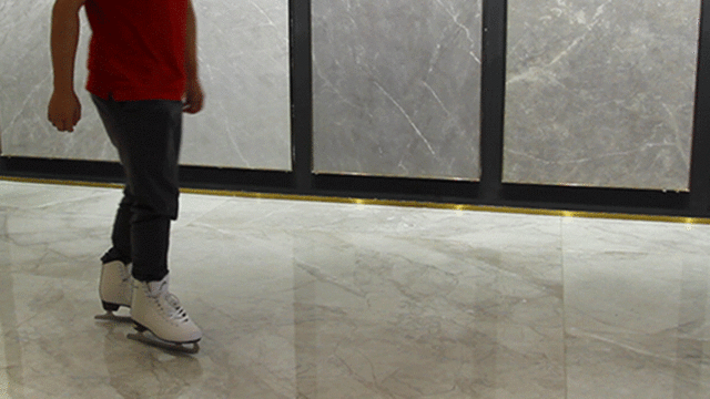 可以看到约70kg重的成年男性穿上冰刀鞋在瓷砖上拖动冰刀鞋活动,脚下也不打滑,看来瓷砖的防滑性能也很不错。
