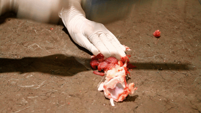我们准备好猪大骨和大砍刀,放在瓷砖表面几番暴力剁砍后,骨头都四处飞溅到一旁了,能过听到刀锋和板面接触的锵锵声。