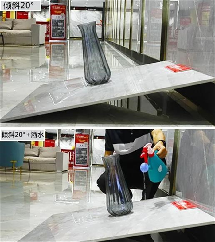 在防滑测试中,评测人员将瓷砖的砖面倾斜度调整至20°左右,在上面放上花瓶。在光洁的瓷砖上,花瓶并无滑落迹象;接着,现场测评人员,在瓷砖的表面洒上水,模仿家里地面有水的情况出现,但瓷砖表面的花瓶始终不动。