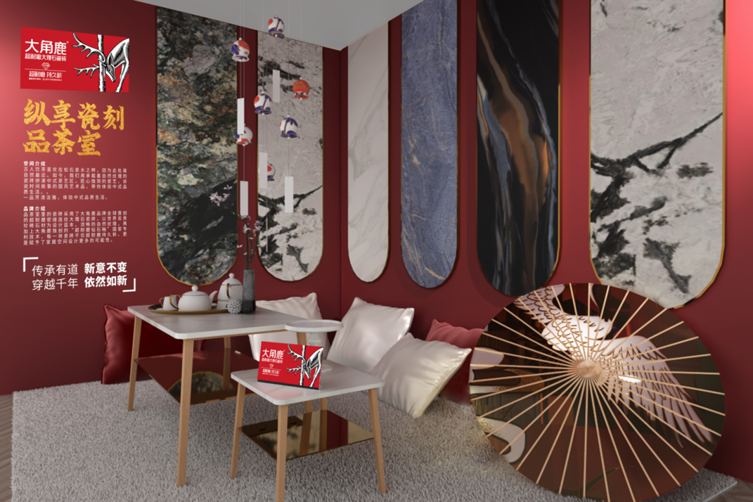 “中国人的家”品茶室里的瓷砖采用了大角鹿品牌全球首创的超耐磨密缝连纹大理石瓷砖,以世界名贵珍稀石材为设计蓝本,流畅的自然纹理,再加上大角鹿独创的“超耐磨钻石釉”国家专利技术,每一块瓷砖不仅超耐磨持久新,更是赋予了家居空间设计更多的可能性。