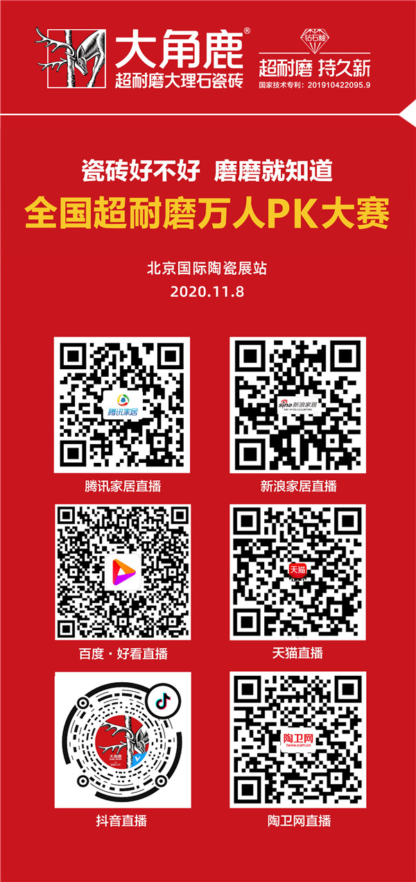 腾讯家居、新浪家居、天猫、抖音、百度、陶卫网六大平台同步直播大角鹿全国超耐磨万人PK大赛·北京国际陶瓷展站。