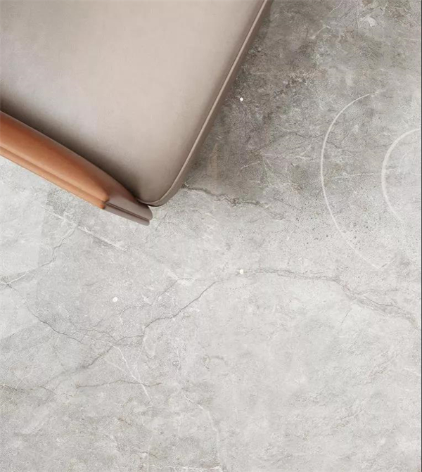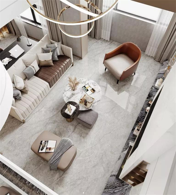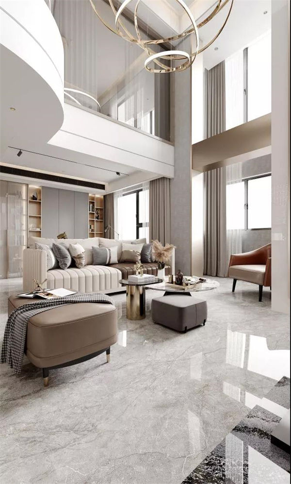 客厅是一个家风格的把控者。金彩汇1068·爱尔兰灰的加入,更是为家居整体氛围定下基调,自然丰富的纹理通过密缝连纹铺贴给人以完整感。挑高式客厅的垂落灯饰、灰白色软装与地面的高级灰瓷砖遥相呼应,透露出张弛有度的力量美学。