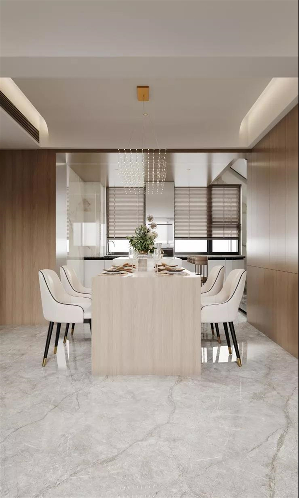 从装饰到陈列,从色彩搭配到材质选择,这一小小餐厅都给人一种优雅从容的感觉。金彩汇1068·爱尔兰灰,纹理自然丰富,密缝连纹铺贴让空间看起来一气呵成,逼真还原天然石材的柔与线条美,想象一下家人在这里享受一顿饭,应该是轻松愉悦的吧。