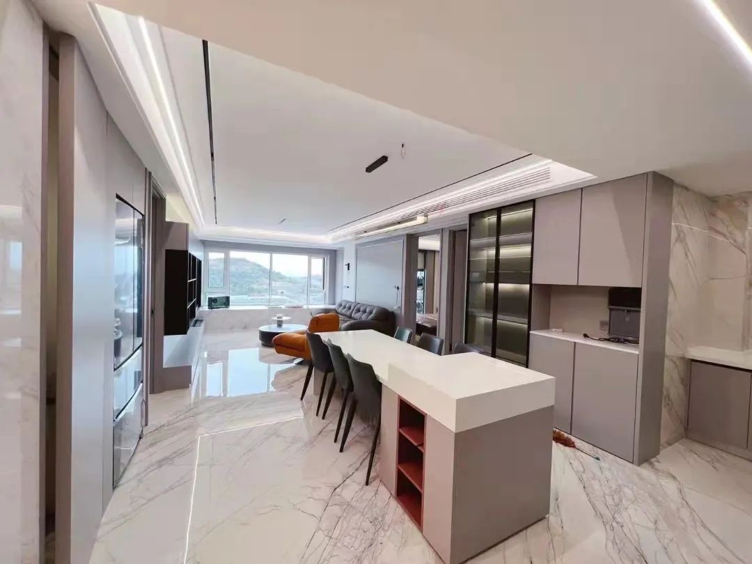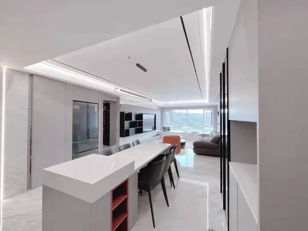 客餐厅相连,再结合大角鹿香雪玫瑰密缝连纹效果,自然之美一气呵成,赋予空间开阔连贯的视觉效果,尽显现代之美。