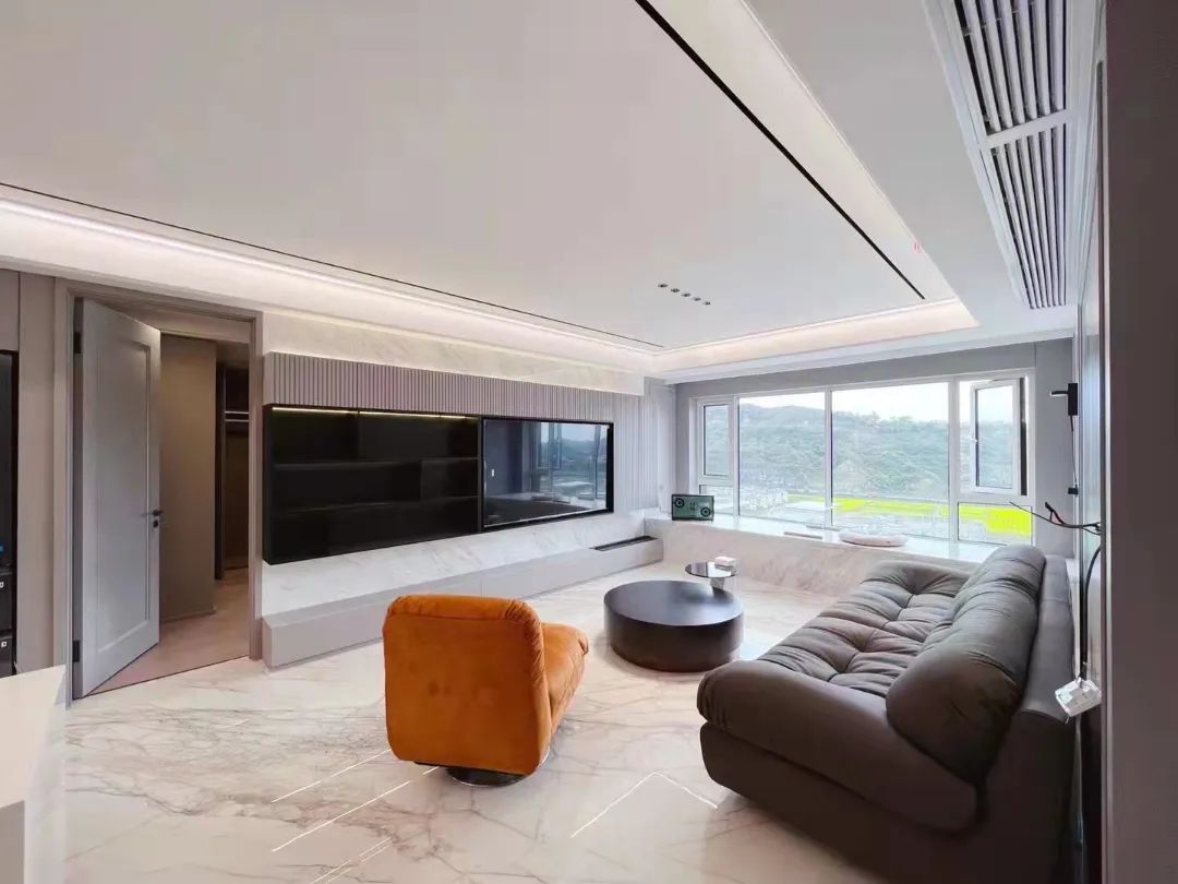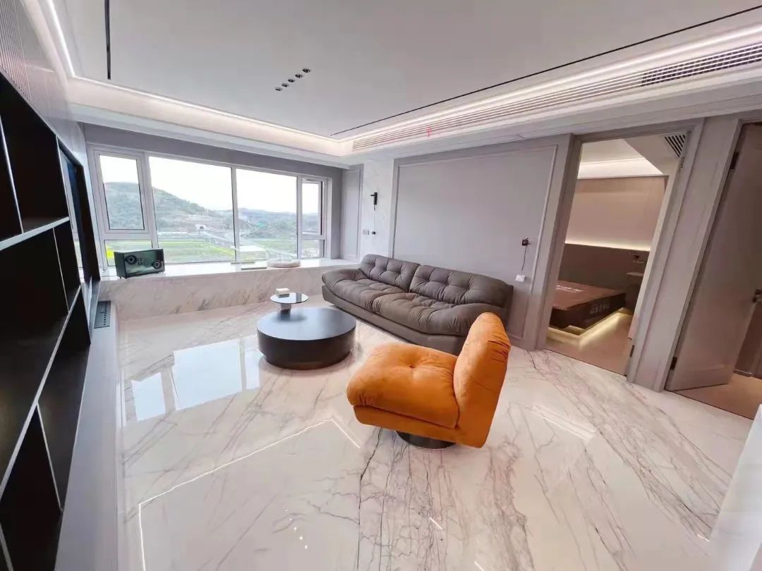大角鹿超耐磨密缝连纹大板·香雪玫瑰逼真还原名贵珍稀石材,纯白底色使瓷砖显得柔和通透,浅灰色的纹理则让空间尽显优雅,搭配灰色系的饰品柜面及橙色单人椅,舒适的家居环境加上窗外自然景色,让人心生愉悦,身居闹市却能享受到这份宁静悠闲。