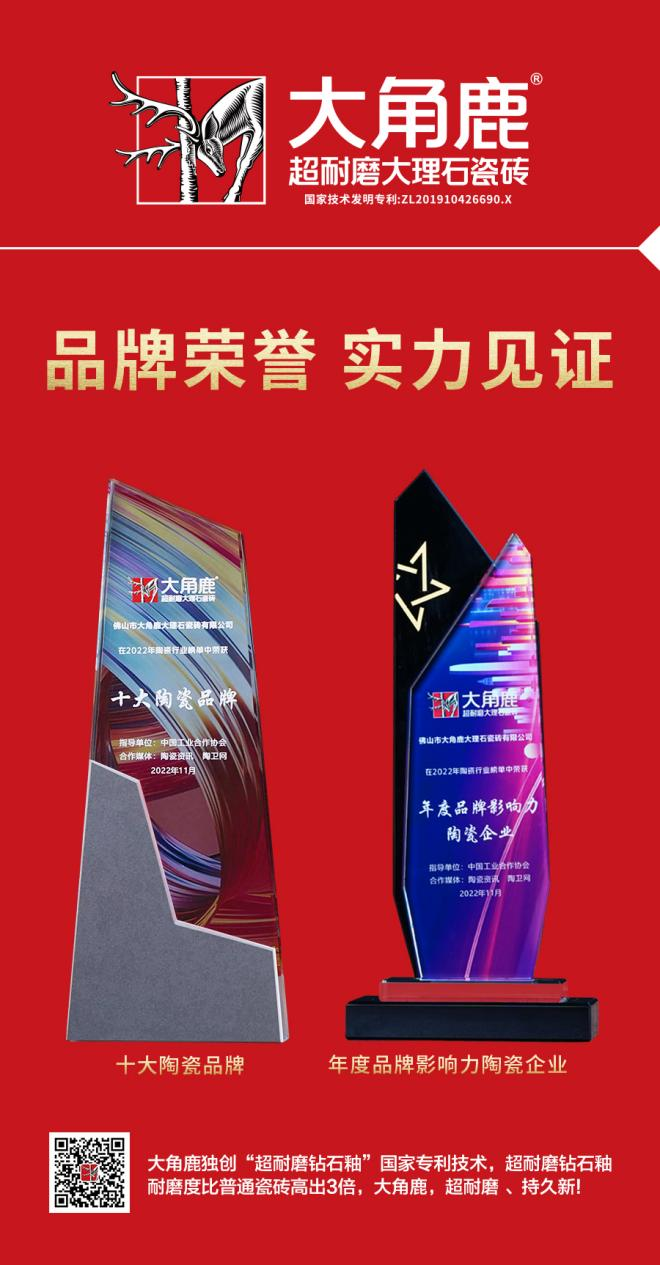 11月11日,由中国工业合作协会家居整装分会、陶瓷资讯、厨卫资讯、陶卫网主办的2022中国建陶产业绿色智造论坛在佛山隆重举行。在活动现场,大角鹿凭借引领全球的超耐磨技术和品牌影响力,在2022年中国陶瓷行业榜单中荣获“十大陶瓷品牌”和“年度品牌影响力陶瓷企业”。