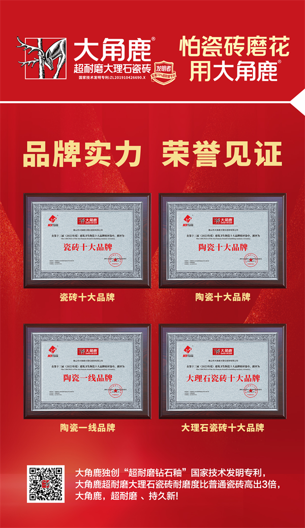作为“超耐磨大理石瓷砖发明者”,大角鹿拥有超七成超耐磨国家发明专利技术,是耐磨度全球第一和超耐磨发明专利数量第一的瓷砖品牌。未来,大角鹿将继续坚持技术创新,致力于超耐磨新材料的研发与生产,让亿万家庭使用上高品质的超耐磨瓷砖,代表中国瓷砖品牌走向全球,成为中国瓷砖全球领导者。