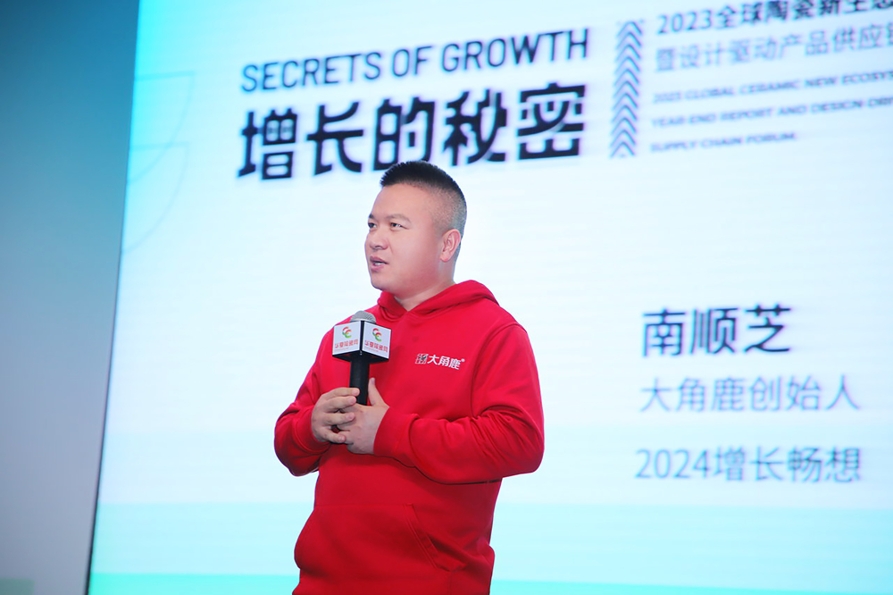 在活动现场,大角鹿创始人南顺芝应邀出席并围绕“大角鹿高速增长的秘密”进行分享。南顺芝指出,大角鹿增长的秘密就是不断创新,顺应市场发展,拓展各种渠道与形式,助推大角鹿瓷砖热销,线上销量也稳定增长,实现了大角鹿国内销量的增长。