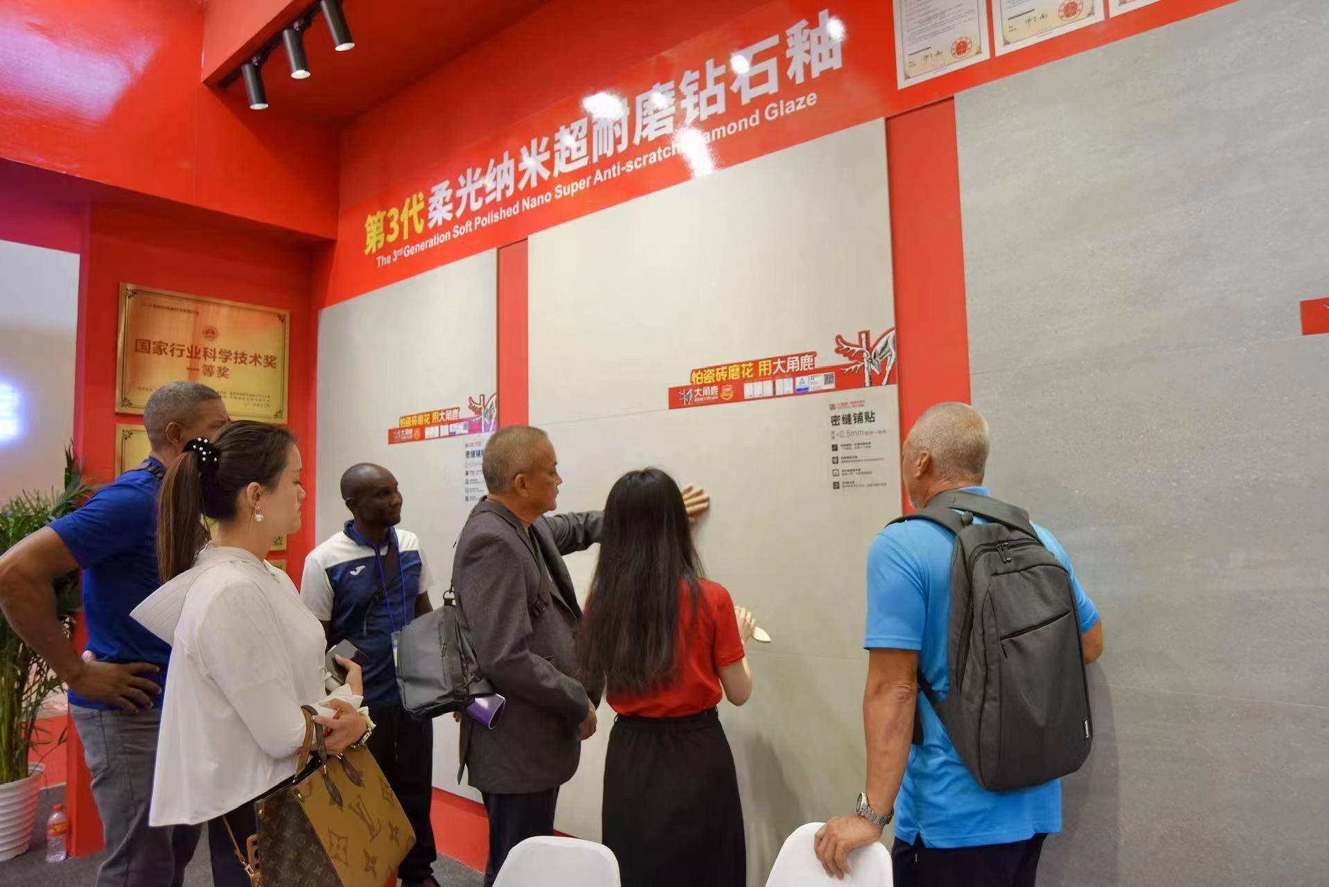 同时,大角鹿还展示了其取得的德国莱茵超耐磨认证和美国超耐磨发明专利证书。在国际双认证的加持下,大角鹿展馆吸引了许多国际面孔,让大角鹿成为本届展会最受国际客商关注的中国瓷砖品牌。