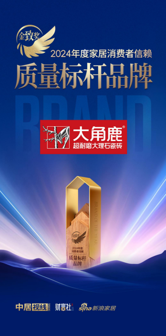 用技术铸就品质,用质量赢得信赖。此次荣获金致奖“2024年度消费者信赖·质量标杆品牌”,是对大角鹿坚持技术创新与质量至上品牌理念的极大褒奖,也体现了行业及市场对品牌的高度肯定。未来,大角鹿将在超耐磨、超抗污领域持续深耕,以技术创新赋能瓷砖品质升级,积极推动行业高质量发展,为全球消费者提供更加高品质的产品。