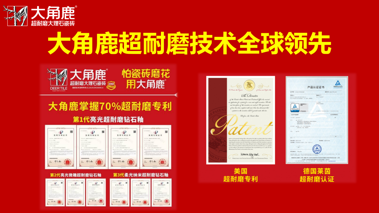 作为瓷砖行业的技术先锋,大角鹿多年来始终致力于耐磨、抗污等瓷砖性能革新,独创超耐磨钻石釉国家专利技术,历经多次迭代升级,将瓷砖耐磨度提升至4级以上,比普通瓷砖高出3倍,引领行业进入“超耐磨”时代。