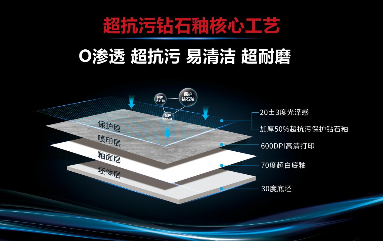 基于前三代超耐磨技术的前沿储备,大角鹿紧扣市场需求不断创新,成功开创超抗污钻石釉技术,并推出了“抗污王”系列超抗污柔光砖。该系列产品集结了超耐磨钻石釉技术和超抗污钻石釉技术,具备“0渗透、超抗污、易清洁、超耐磨”四大硬核性能,重新定义了柔光砖的抗污及美学标准,为消费者带来了更加优质、实用、美观的家装选择。