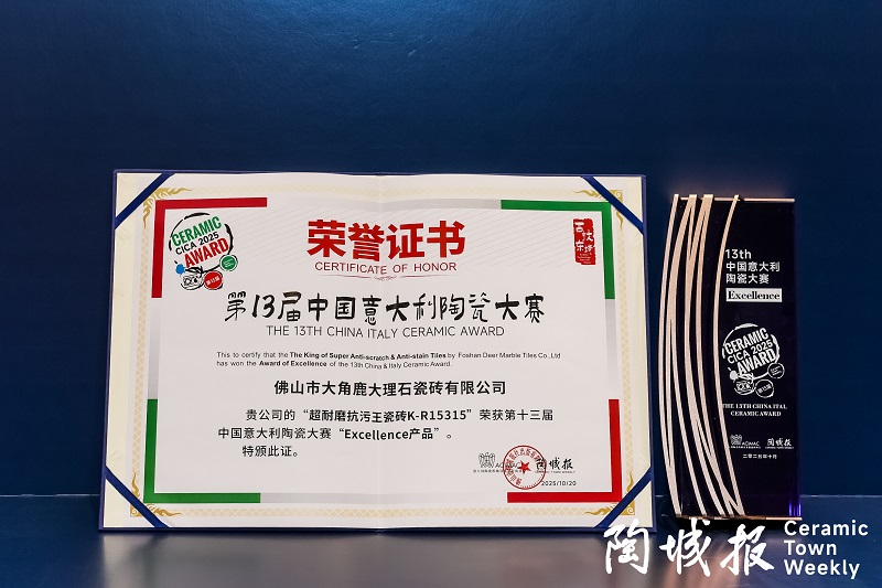 与此同时,在本次活动上,大角鹿超耐磨抗污王瓷砖荣获了“中国意大利陶瓷大赛·Excellence产品”。中国意大利陶瓷大赛是由ACIMIC意大利陶瓷机械与制造商协会和陶城报社共同主办的,是中国陶瓷行业唯一的国际性赛事,代表了行业领先水平。