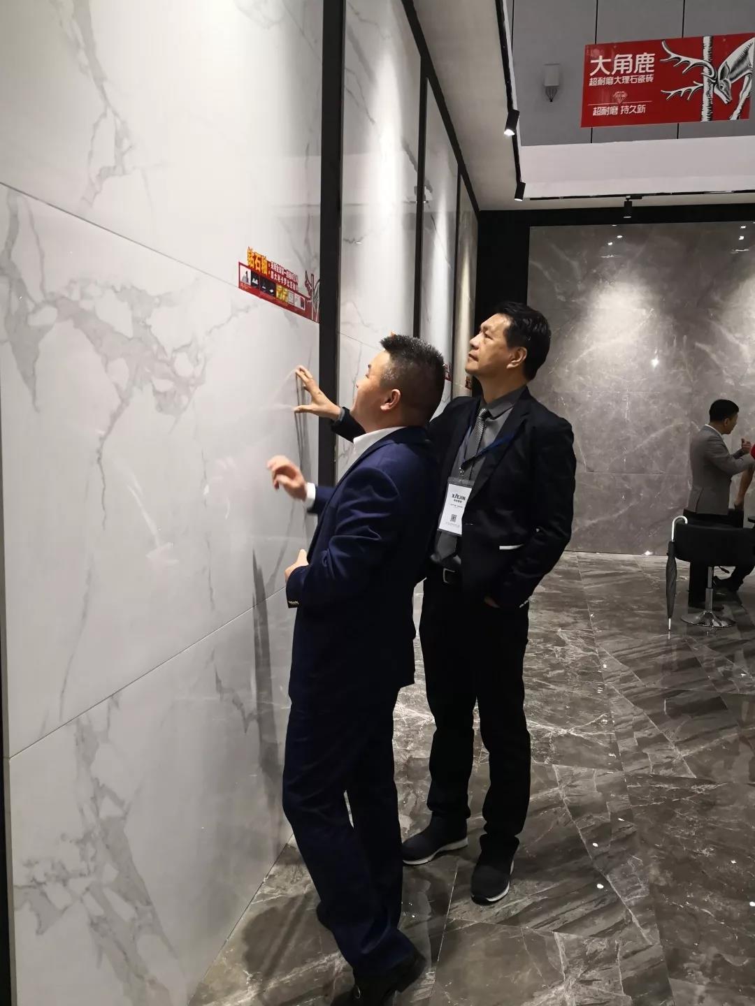据悉,大角鹿超耐磨展位现场吸引了碧桂园控股有限公司创始人、董事局主席杨国强亲临大角鹿展位考察。超耐磨大理石瓷砖对大地产商来说有很重要的价值,瓷砖耐不耐磨在地产项目公共区域更加重要!